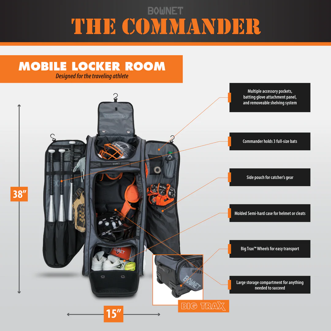 And you don’t need to be a catcher to own Bownet’s Commander bag. Baseball and softball players nationwide have adopted this “Baseball Equipment Locker” as a top choice for Little League, Travel Ball, High School, and College players of all positions.
